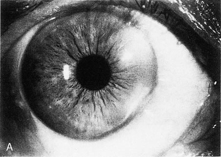 Fig. 13. Terrien's marginal degeneration. A. Slit lamp photograph showing peripheral corneal thinning in the inferior and superior nasal quadrants of the right eye. Two areas with prominent peripheral white lines were present from the 1- to 3-o'clock and the 3:30- to 6-o'clock positions. A small area of normal cornea separates the abnormal area from the limbus. B. Topographic map (normalized scale) demonstrates flattening of the superior and inferior nasal peripheral cornea that corresponds to the area of thinning. This flattening compromises the visual axis and produces less than 1 diopter of cylinder, detected also by refraction and keratometry. Wilson S, Lin D, Klyce S et al: Terrien's marginal degeneration: Corneal topography. Refract Corneal Surg 6:15–20, 1990.)