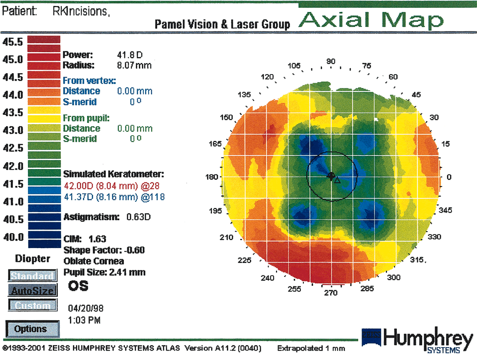 Radial keratotomy (RK) induces central flattening by deep radial incisions. The central 3-mm optical zone remains untouched. The corneal profiles seen after RK (Table 1) are oblate (79%) and a mixed pattern of oblate/prolate (18%). The radial incisions produce a rapid change in slope called the paracentral knee (inflection zone) that lies between the zone of peripheral steepening and central cornea flattening. Topographic patterns seen after RK are the same spectrum as for normal corneas with the addition of the polygonal pattern. The polygonal pattern is seen in 59% of cases and is a concentric pattern with two or more angles (135 degrees) and three or more nearly straight lines that correspond to the central ends of the radial incisions. In all RK cases the corneal asphericity is increased. Initially, maximal flattening is present at the proximal end of the incisions in the paracentral zone, whereas the central cornea remains steeper. With time, the central cornea becomes flatter. The cornea can mimic a multifocal lens as a result of the increased range of diopters within the pupillary aperture35 (Fig. 15).