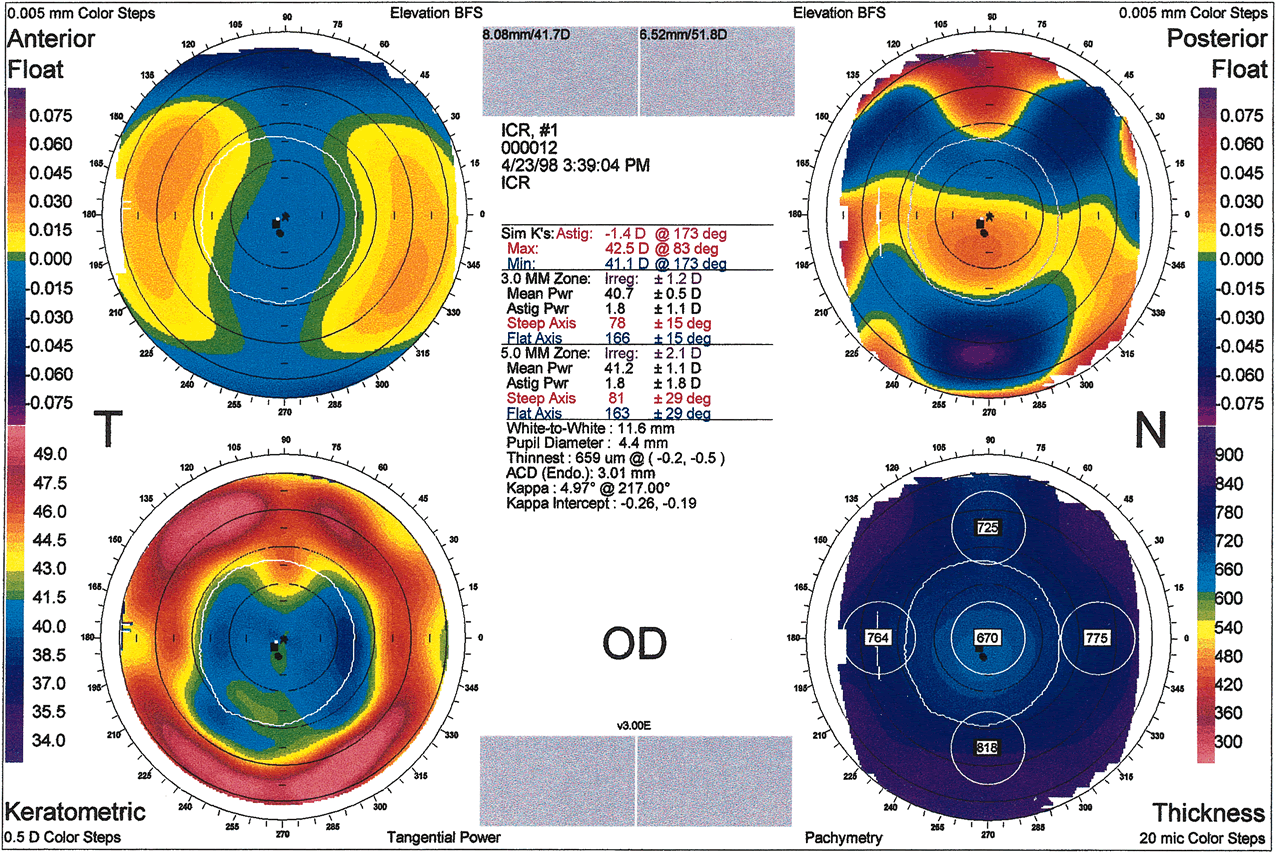 Corneal elevation patterns on the Orbscan are measured as compared to a best-fit sphere. Liu et co-workers classified anterior and posterior elevation patterns seen amongst normals into five categories. Anterior corneal elevation patterns occur with the following frequency: the island (72%), incomplete ridge (20%), regular ridge (4%), irregular ridge (2%), and unclassified (2%). Posterior elevation patterns occur with a different order of frequency: the island (33%), regular ridge (30%), incomplete ridge (24%), irregular ridge (13%), and unclassified (0%).12