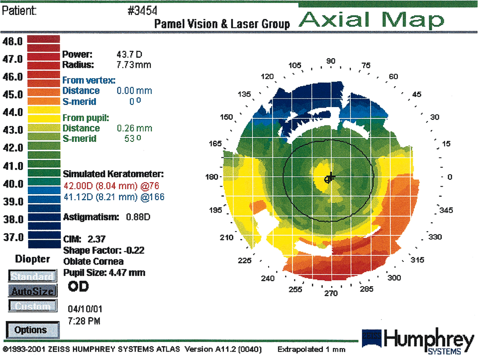 Fig. 19. Corneal warpage secondary to soft contact lens wear. This case shows an asymmetric oblate bow-tie pattern. Corneal warpage may simulate keratoconus with loss of central radial symmetry and the presence of irregular astigmatism due to superior flattening and inferior steepening. (Courtesy of Gregory Pamel, MD.)