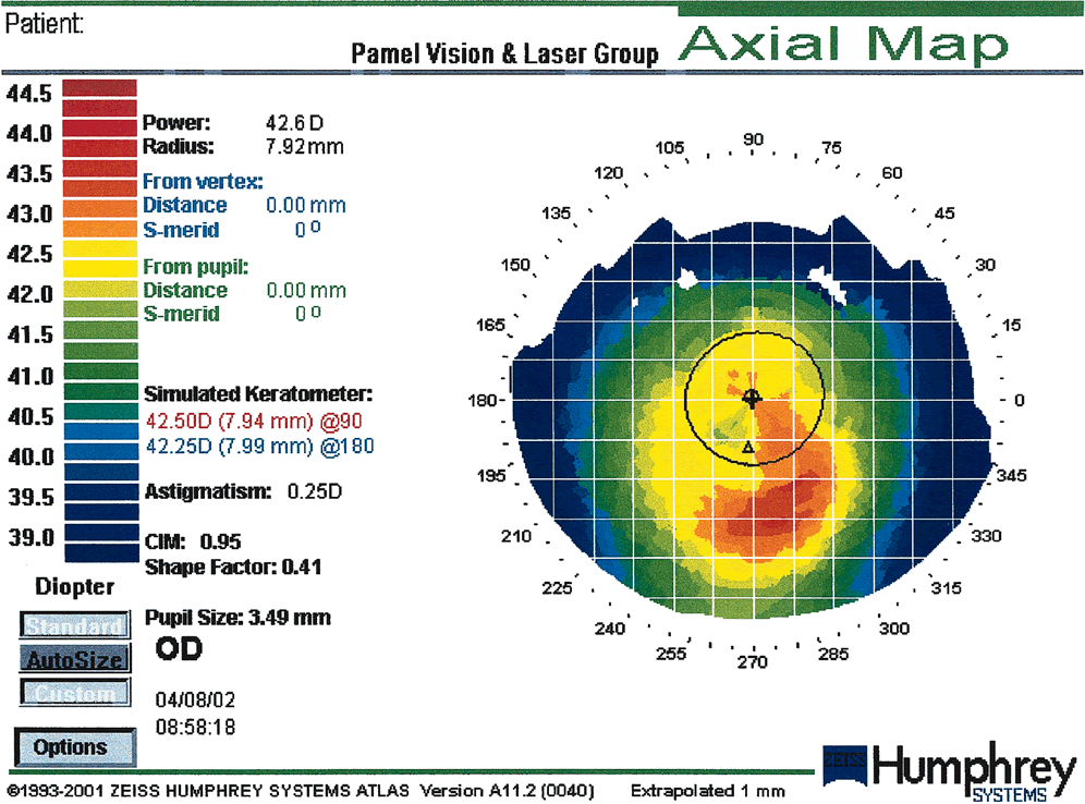 Videokeratoscopes display topographical information using different maps. A picture of the cornea is provided as a raw image. This allows the clinician to recognize distortions of the tear film and loss of fixation that may compromise the accuracy of the videokeratoscopy. The data is then presented as a color map with either an absolute or a normalized scale. On color maps, the warmer colors (red, orange, and yellow) represent the steeper areas; the cooler colors (blue and green) represent the flatter regions. The absolute scale is a fixed system in which each color is consistently assigned to a particular curvature or power. This facilitates the comparison of topographies between patients and over time in the same patient. Each videokeratoscope has its own absolute color map with fixed diopteric intervals covering the range of corneal powers. The normalized (relative) scale maximizes the utilization of all possible colors to evaluate a specific cornea. The color map with a normalized scale has narrower intervals between the assigned colors. Although the normalized scale allows the clinician to evaluate a particular topography with greater detail, it makes comparison between examinations difficult because the scale may have changed in range and diopteric interval. Another option available to the clinician is the adjustable scale, which allows the clinician to customize the step interval and diopteric range of the contours.